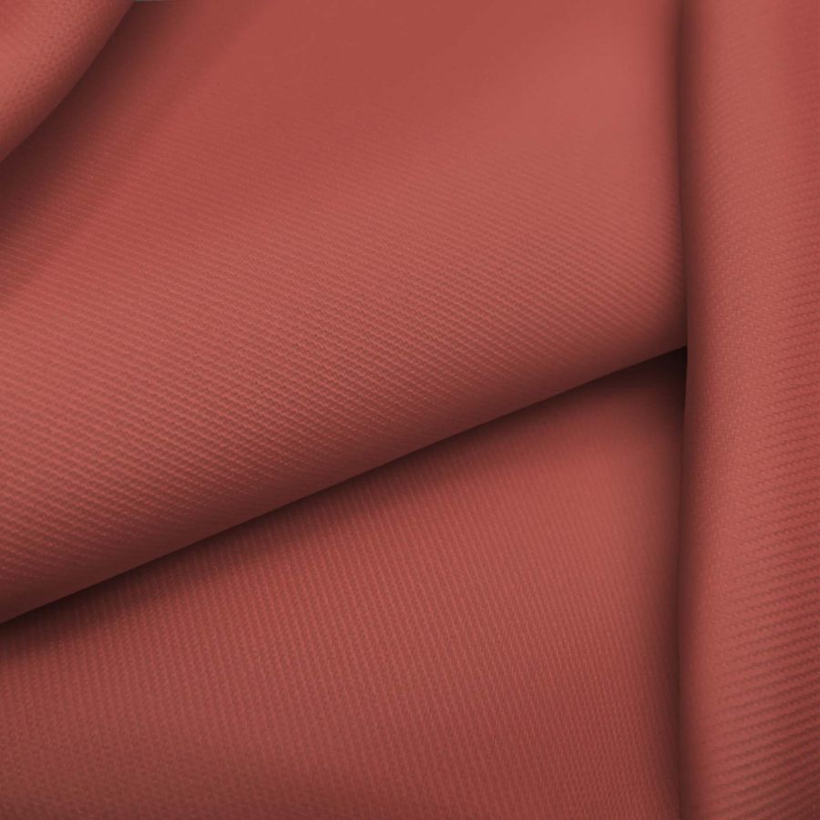 La tela base de esta prenda es Sarga - Prada, compuesta de 96% poliéster y 4% elastano, con un gramaje de 220 gr/m2 y un ancho de 150 cm. El color liso impreso es un rojo ladrillo refractario, con un contenido de CMYK de 24-75-66-16. Este color secundario es un color cálido, que evoca la sensación de la tierra y el fuego, y que combina muy bien con tonos tierra, azules oscuros y grises.