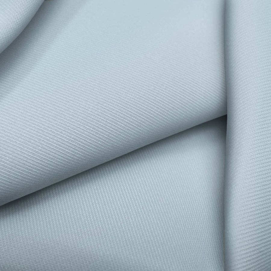 La tela base es una sarga de composición 96% poliéster y 4% elastano, con un gramaje de 220 gr/m2 y un ancho de 150 cm. El color liso impreso es un tono azul intenso, reflejado en el CMYK 28 5 8 0. El color secundario es un azul del golfo que simboliza la paz y la tranquilidad, se combina especialmente con tonos neutros como el blanco y el negro. El tejido está impreso con el color liso a una sola cara por impresión digital textil, lo que permite una gran definición en la impresión.