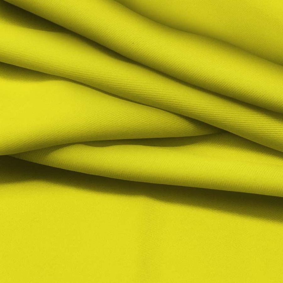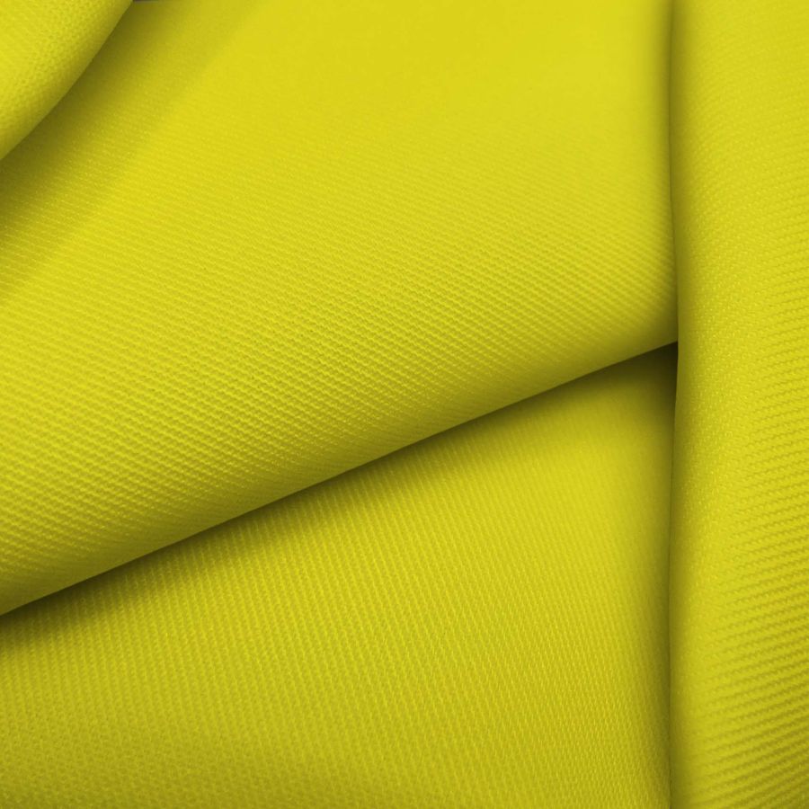 La tela base es una sarga prada compuesta por un 96% de poliéster y un 4% de elastano con un gramaje de 220 gr/m2 y un ancho de 150 cm. El color liso impreso es amarillo canario con una composición de tinta cyan del 12%, tinta magenta del 1%, tinta yellow del 90% y tinta black del 0%, con un CMYK de 12 1 90 0. Este color amarillo canario es un color que simboliza la alegría y el optimismo. En combinación con otros colores, se complementa especialmente bien con tonos más oscuros, como el azul oscuro y el negro, pero también con tonos más claros, como el blanco.