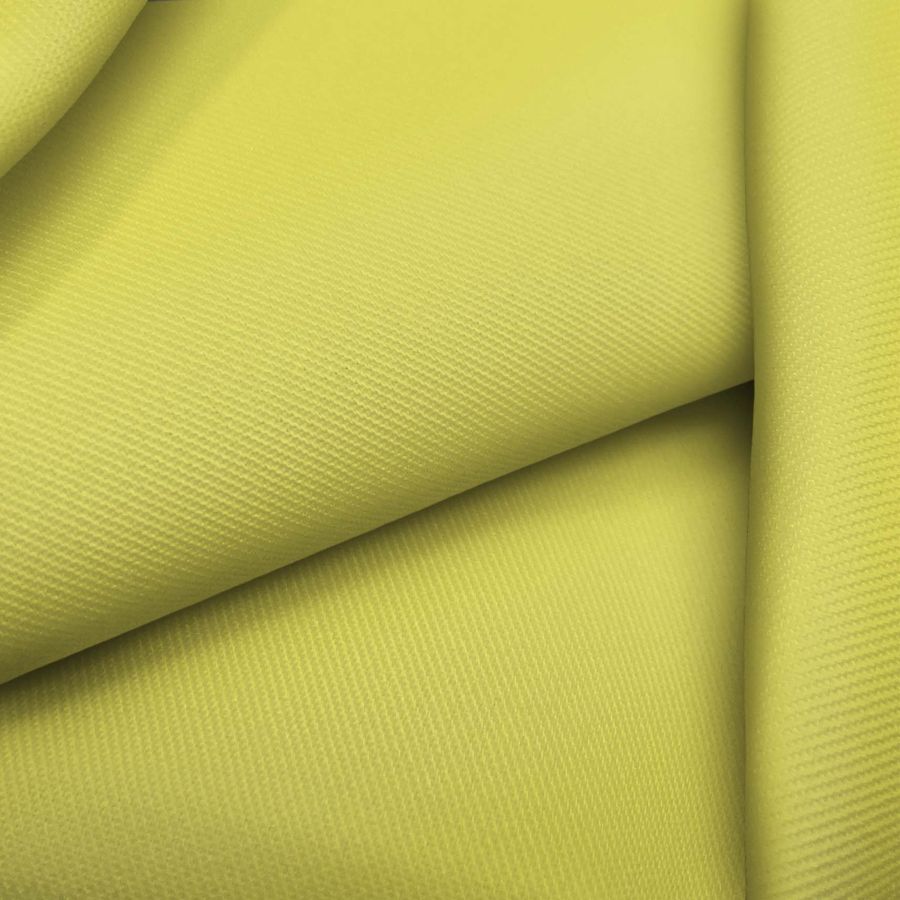 La tela base de este tejido es la Sarga - Prada, compuesta por un 96% de poliéster y un 4% de elastano, con un gramaje de 220 gr/m2 y un ancho de 150 cm. El color liso impreso es un Amarillo canario, cuya composición está representada por la tinta Cyan 11, la tinta Yellow 74 y un CMYK de 11 0 74 0. Este color es simbólicamente alegre y lleno de energía. Técnicamente, el color secundario es un amarillo suave y brillante, que combina muy bien con los tonos tierra y los verdes. Es importante destacar que la tela está impresa con el color liso a una sola cara mediante impresión digital textil.
