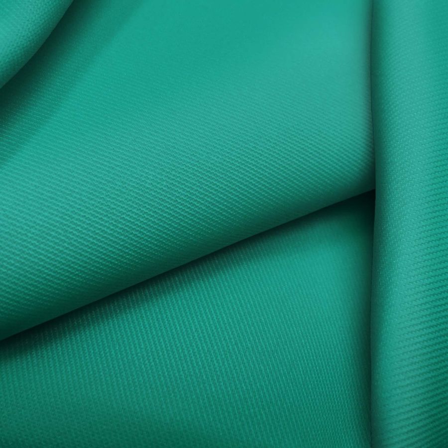 La tela base es una sarga Prada, compuesta por un 96% de poliéster y un 4% de elastano, con un gramaje de 220 gr/m2 y un ancho de 150 cm. El color liso impreso es de un verde menta oscuro, con una combinación de 83% de cian, 21% de magenta, 60% de amarillo y 5% de negro, según los atributos del CMYK. Esta tonalidad se caracteriza por su elegancia y su frescura, y combina con otros tonos pastel como el rosa, el lila o el celeste.
