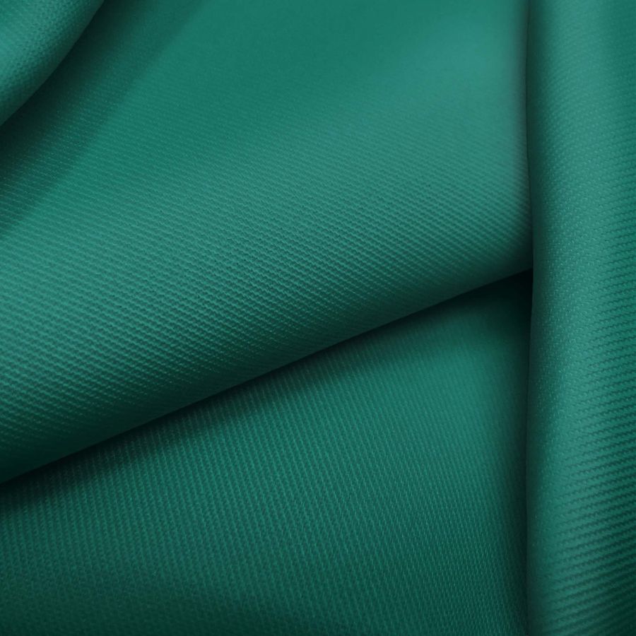 La tela base es Sarga - Prada, compuesta por un 96% de poliéster y un 4% de elastano, con un gramaje de 220 gr/m2 y un ancho de 150 cm. El color liso impreso es Verde mar profundo, con un CMYK de 89 36 65 33 y es impreso digitalmente a una sola cara. Es una tela de textura suave y delicada, con un tacto suave y delgado.