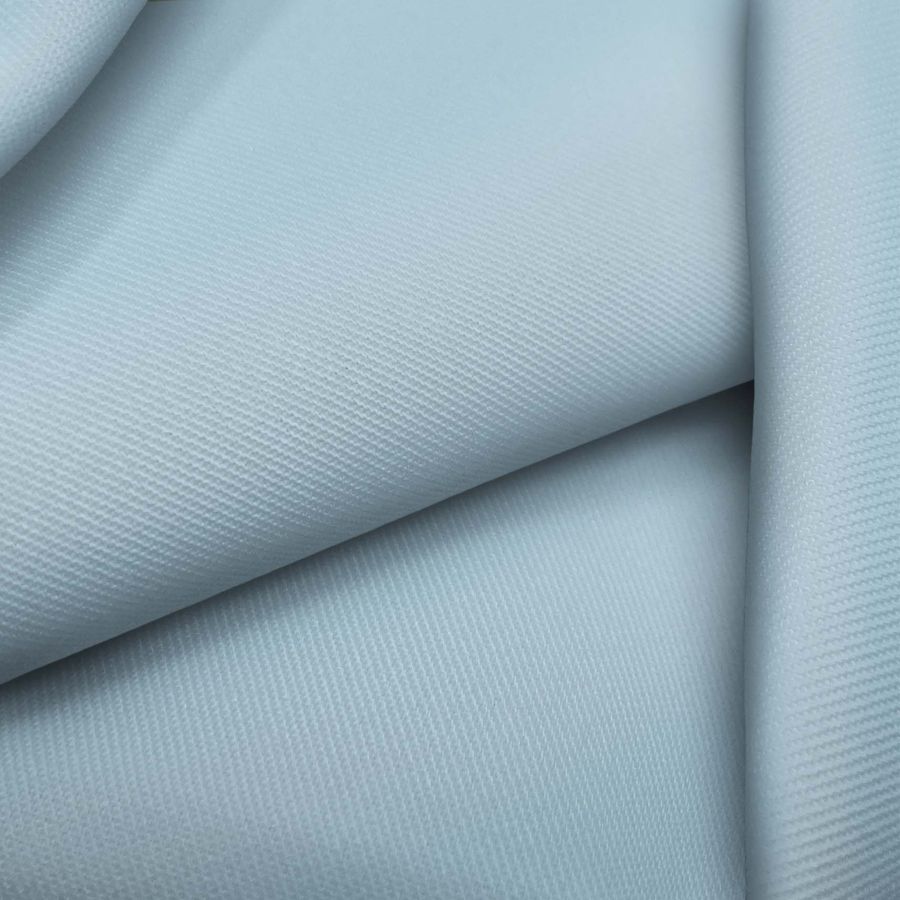 La tela base es una Sarga Prada de composición 96% poliéster y 4% elastano, con un gramaje de 220 gr/m2 y ancho de 150 cm. El color liso impreso es un hermoso tono de azul coral, con una combinación de tinta Cyan: 35, Magenta: 6, Yellow: 8 y Black: 0, representando un CMYK de 35 6 8 0. La tela impresa es a una sola cara por medio de impresión digital textil.