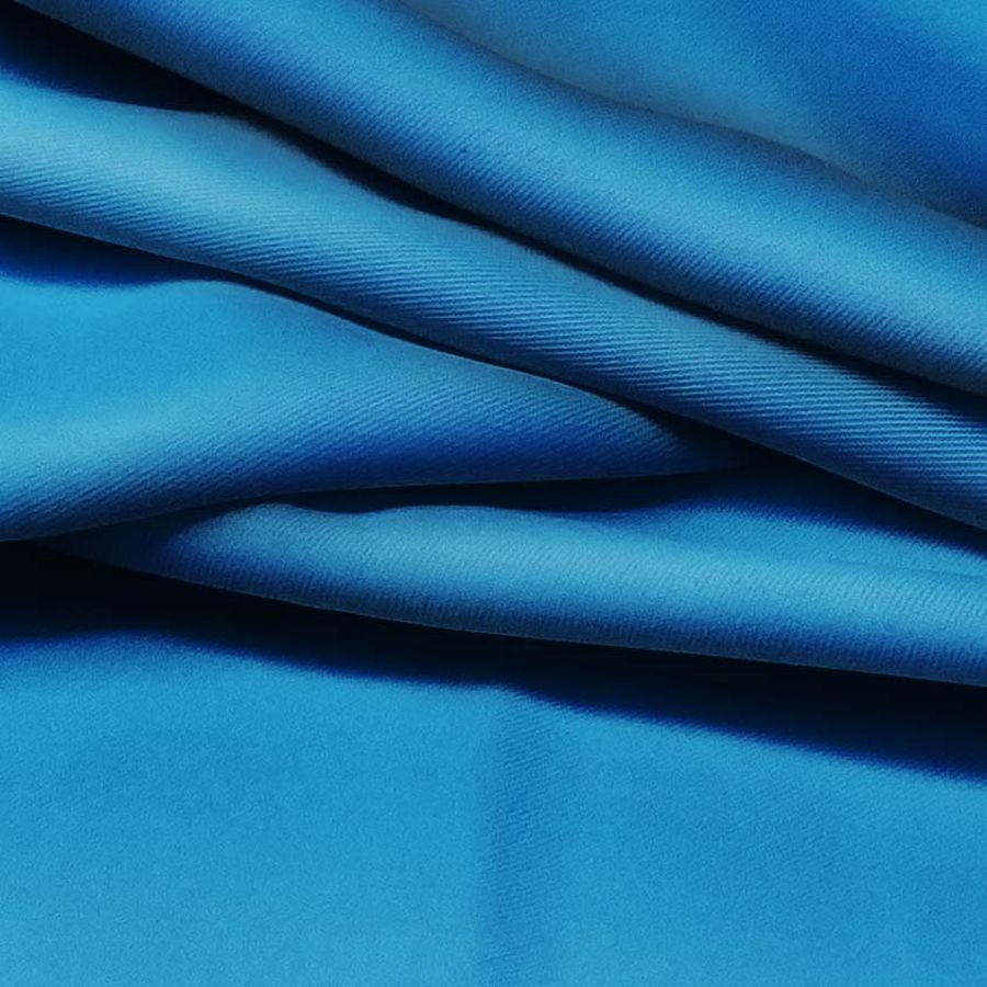 La tela base es una sarga de poliéster y elastano de 220 gr/m2, con ancho de 150 cm, suave al tacto y de textura delgada. El color liso impreso en esta tela es un azul de ojos azules, con un CMYK de 92 57 13 2, lo que significa que tiene una alta intensidad de cian y un poco menos de magenta, un bajo nivel de amarillo y negro. Este color evoca serenidad, inteligencia y confianza, y se combina fácilmente con tonos neutros como el blanco, el gris y el negro, así como con tonos más vivos como el amarillo, el rosa y el verde.