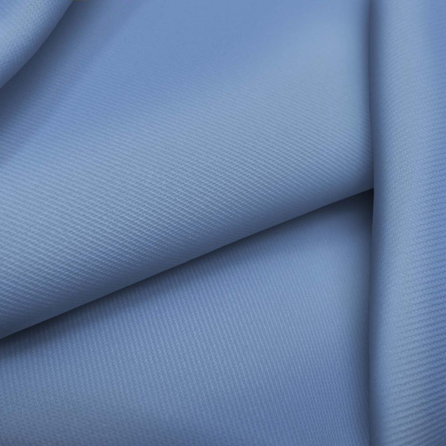 La tela base es la Sarga - Prada, compuesta por un 96% de poliéster y un 4% de elastano, con un gramaje de 220 gr/m2 y un ancho de 150 cm. El color liso impreso es de un azul violeta claro, con un CMYK de 60 38 4 0 y una tecnología de impresión de sublimación (poliéster). Este color combina perfectamente con tonos grises y cremas, así como con otros tonos de azul y violeta. Es importante destacar que la tela está impresa con el color liso a una sola cara por impresión digital textil, lo que significa que no es un tejido tintado sino impreso por una sola cara.