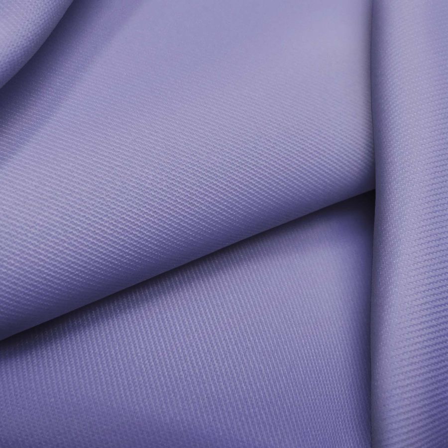 La tela base es una sarga de poliéster y elastano de 220 gr/m2 de gramaje y 150 cm de ancho de la marca Prada. El color liso impreso es un morado oscuro que remite a un arbusto de salvia púrpura con un contenido de CMYK de 56 53 6 0. Este color es simbólico en cuanto a que representa la conexión con la espiritualidad y la paz interior, y técnico en cuanto a que su pigmentación específica le da una tonalidad oscura y sofisticada. Este color se combina bien con otros tonos pálidos o metalizados, como el gris, el dorado y el rosa. El tejido se imprime a una sola cara por impresión digital textil y no es tintado.