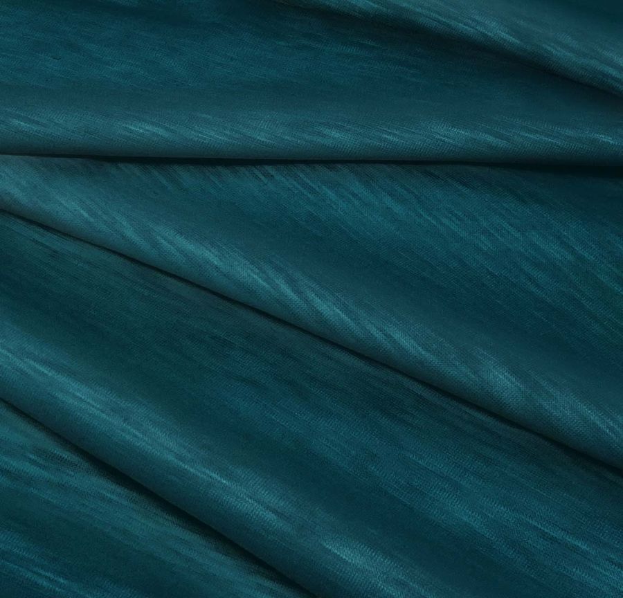 La tela base, Punto Camiseta Jaspeado - Dubái, está compuesta por un 100% de poliéster y cuenta con un gramaje de 135 gr/m2 y un ancho de 160cm. Se ha impreso con un color liso de tonos verdes y teal profundo, cuyo contenido de tinta de cian, magenta, amarillo y negro es de 96, 58, 50 y 50, respectivamente, con un CMYK de 96 58 50 50. Este color secundario se asocia a la tranquilidad, la paz y la sutileza, y combina especialmente bien con tonos blancos, grises y marrones.