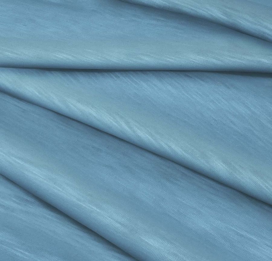 Este tejido está impreso con el color liso a una sola cara por impresión digital textil, lo que significa que el diseño está impreso en una sola cara del tejido. La textura y el tacto de la tela son liso y suave, mientras que su aspecto visual es translúcido y jaspeado. También es elástico, lo que la hace ideal para prendas de punto como camisetas y sudaderas.