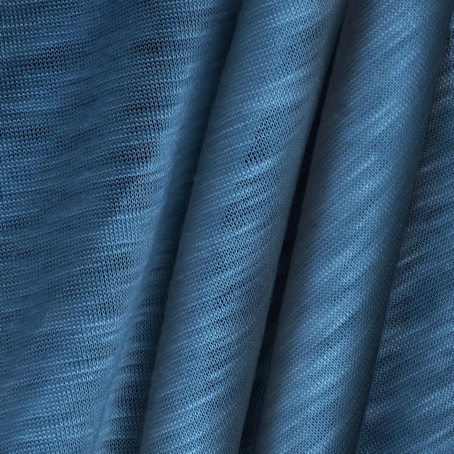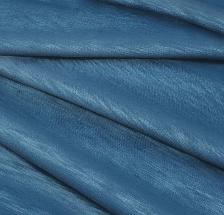 La tela base de la que hablaremos a continuación es la Punto Camiseta Jaspeado - Dubái, una tela de punto compuesta al 100% de poliéster. Esta tela tiene un gramaje de 135 gr/m2 y un ancho de 160 cm. El color liso impreso en esta tela es de un tono azul arrendajo, con un CMYK de 81 54 32 17. Este color mezcla perfectamente con tonos grises, blancos y otros tonos azules para crear un diseño que resalte y genere un gran equilibrio visual. Hay que destacar que la tela se imprime a una única cara por impresión digital textil, lo que da como resultado un tejido colorido y vibrante.