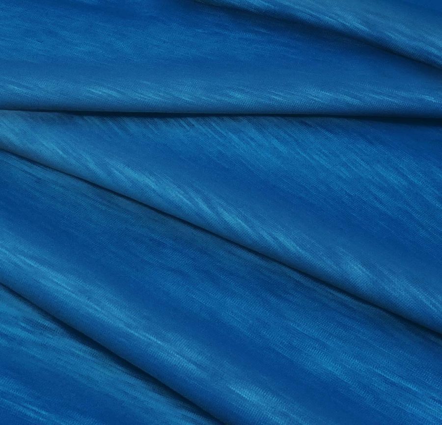 La tela base es el Punto Camiseta Jaspeado - Dubái, un tejido de punto compuesto por 100% poliéster, de gramaje de 135 gr/m2 y ancho de 160 cm. Su color liso impreso es Azul zafiro, con un CMYK de 98 67 20 5. El color azul zafiro se caracteriza por ser un tono intenso y vibrante, con un matiz de azul profundo. Combina muy bien con tonos blancos, grises y negros, aportando un contraste muy especial a la prenda. La tela base se imprime con el color liso a una sola cara mediante impresión digital textil.