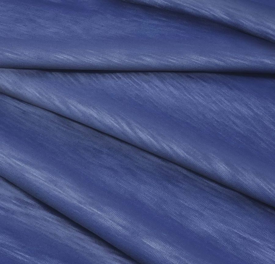 La tela base es la Punto Camiseta Jaspeado - Dubái, una tela de punto compuesta al 100% de poliéster con un gramaje de 135 gr/m2 y un ancho de 160 cm. El color liso impreso es un Azul Ballena Azul con valores CMYK de 83 71 26 10. Presenta una textura jaspeada y elástica con un tacto suave y agradable. El color secundario aporta una sensación de calma y tranquilidad, y combina perfectamente con colores neutros como el blanco o el gris, y también con tonos más fuertes como el negro o el rojo. La tela está impresa con el color liso a una sola cara por impresión digital textil.