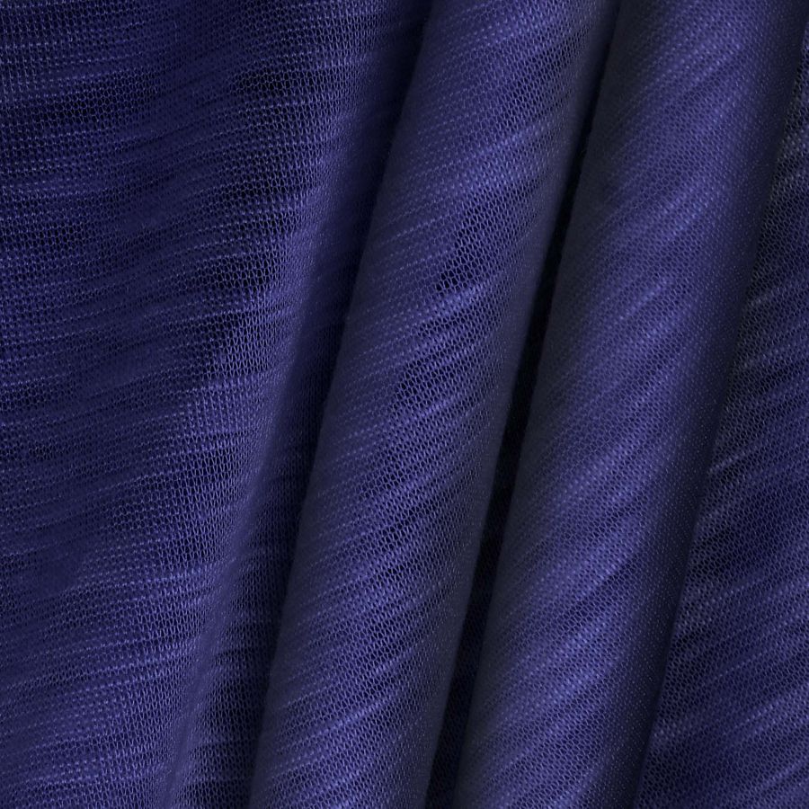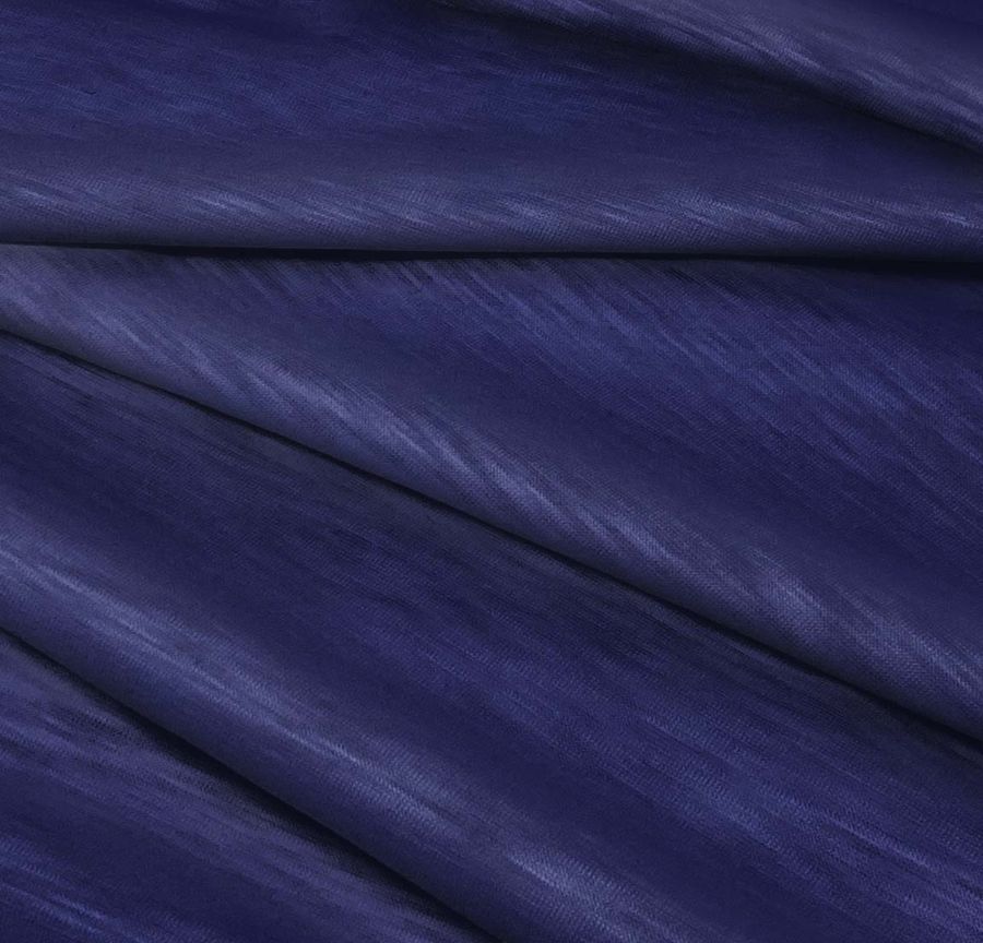 La tela base es la Punto Camiseta Jaspeado - Dubái, una tela de punto compuesta por 100% poliéster, con un gramaje de 135 gr/m2 y ancho de 160 cm. La tela tiene un acabado jaspeado que le otorga un aspecto de profundidad y textura. El color liso impreso es azul noche, el cual se obtiene mediante la mezcla de cian, magenta, amarillo y negro en un CMYK de 98 94 35 33. El resultado es un color profundo y elegante que combina muy bien con tonos neutros y metálicos, como el gris o el plata.