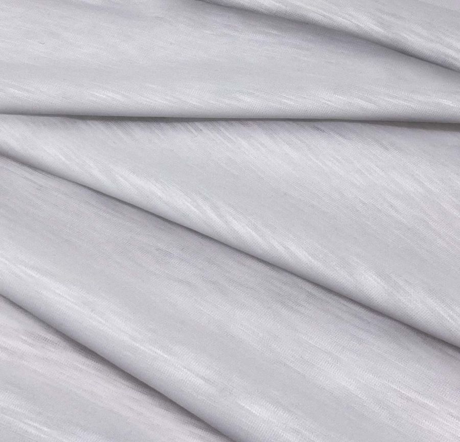 La tela base es el Punto Camiseta Jaspeado - Dubái, un tejido de punto compuesto al 100% de poliéster con un gramaje de 135 gr/m2 y un ancho de 160 cm. El color liso impreso en la tela base es un Morado/Lila, cuyo contenido en el CMYK es de 13-16-2-0, dando lugar a un tono suave y delicado en la prenda. Este color secundario transmite equilibrio, tranquilidad y espiritualidad. Combina perfectamente con tonos grises, cremas y rosados.