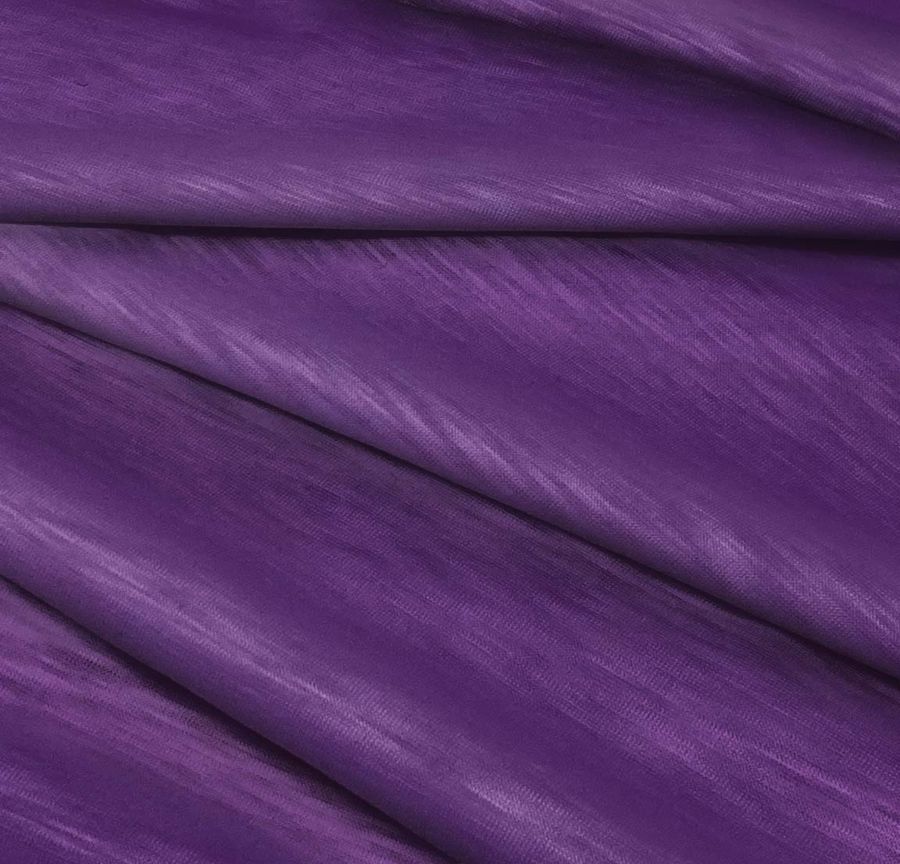 La tela base, Punto Camiseta Jaspeado - Dubái, es una tela de punto de 100% poliéster con un gramaje de 135 gr/m2 y un ancho de 160 cm. Su color liso impreso es un morado mermelada púrpura, cuyas tintas CMYK son 76 92 26 16. Este color se caracteriza por ser vibrante, elegante y sofisticado, presentando una tonalidad rica y profunda en el espectro del morado. Está en armonía con tonalidades grises, tonos lila y pasteles, además de contrastar con tonos azules.