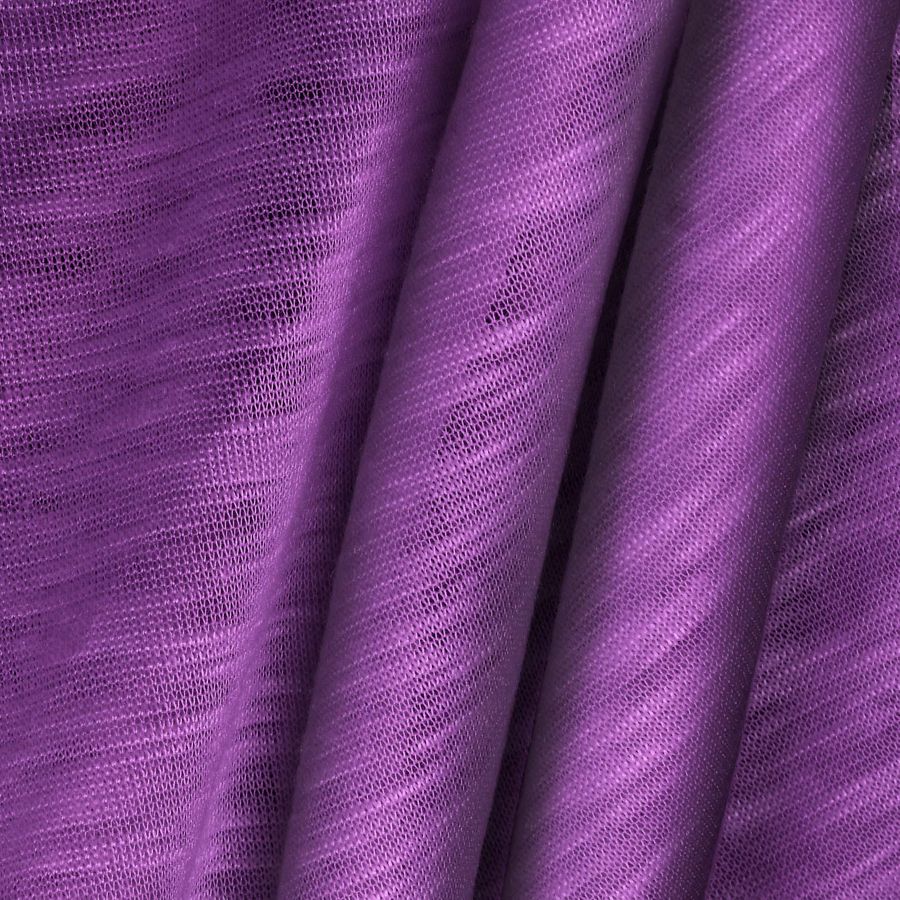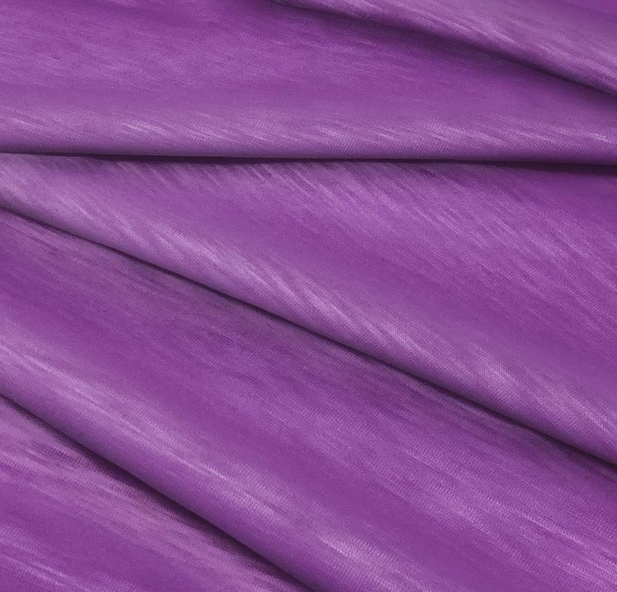 La tela base, Punto Camiseta Jaspeado - Dubái, es una tela de punto compuesta al 100% por poliéster con un gramaje de 135 gr/m2 y un ancho de 160 cm. Su color liso impreso es Iris Morado, que se obtiene a través de una combinación de tintas que dan como resultado un CMYK de 57 80 5 0. Este color destaca por su tonalidad cálida y profunda, con una mezcla de tonos rojos y azules que simboliza la ambigüedad y el misterio. Se combina de manera ideal con colores blanco, gris, negro y tonos pastel para resaltar su efecto dramático.
