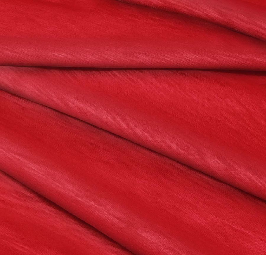 La tela base es Punto Camiseta Jaspeado - Dubái, una tela de punto 100% poliéster con un gramaje de 135 gr/m2 y un ancho de 160 cm. El color liso impreso es Rojo Pimiento Picante, con un CMYK de 17 100 89 7. Este intenso color rojo es una combinación de intensos tonos magenta y amarillo, con un toque de cian y negro. Perfectamente vibrante y atrevido, este color complementa especialmente bien con tonos neutros como el negro y el blanco, así como con gris, verde oscuro y azules profundos. Este color se logra mediante impresión digital textil a una sola cara, lo que resulta en una tela suave y táctil que es duradera y resistente.
