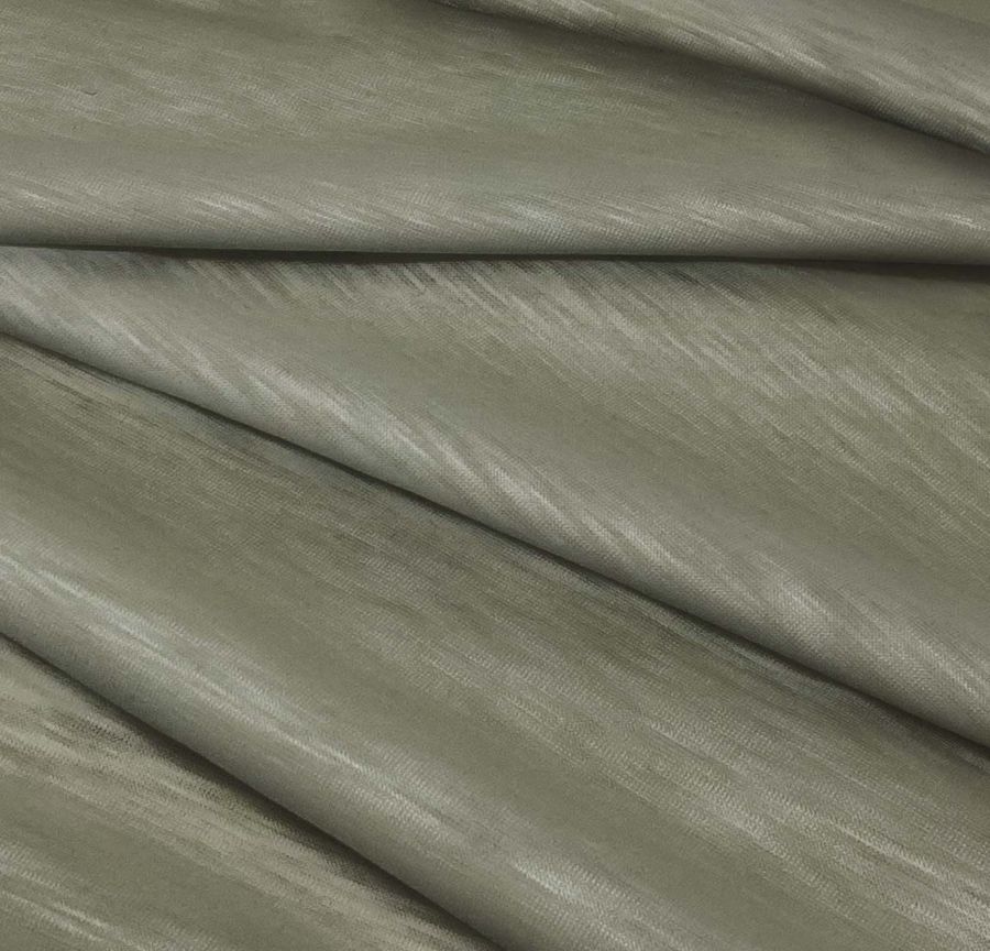 Debemos mencionar que la tela base está impresa con el color liso solo por una cara por impresión digital textil, no se trata de un tejido tintado sino impreso. La textura y el tacto de la tela son lisos y agradables al contacto, posee cierta elasticidad y, visualmente, se presenta ligeramente jaspeado y translúcido.
