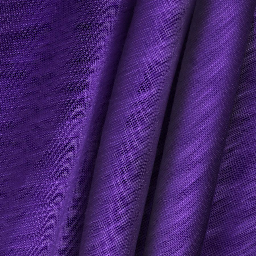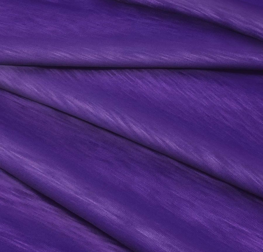 La tela base es la Punto Camiseta Jaspeado - Dubái, un tipo de tela de punto con una composición de 100% poliéster y un gramaje de 135 gr/m2. Su ancho es de 160 cm y su cuidado recomendado incluye no blanquear, lavar a una temperatura máxima de 30ºC, admitir limpieza en seco salvo tricloroetileno, planchar a temperatura fría y no secar con secadora. En cuanto al color liso impreso, presenta un tono morado e índigo, siendo sus valores de tinta de cyan 88, magenta 100, yellow 14 y black 4, correspondiendo así a un CMYK de 88 100 14 4. Este color presenta una tonalidad cálida y atractiva, vinculada a la creatividad y la calma. Combina perfectamente con tonos verdes, amarillos y naranjas, generando una paleta armónica y vigorosa.
