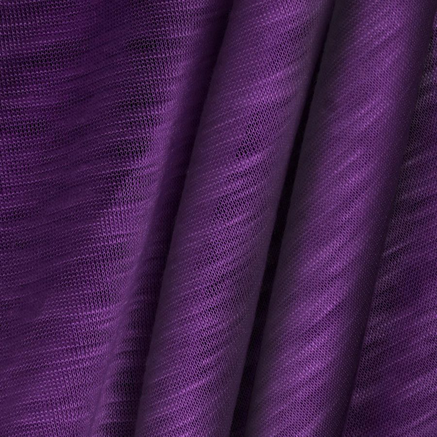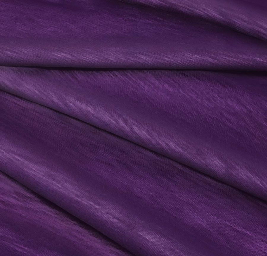 La tela base es el Punto Camiseta Jaspeado - Dubái, una tela de punto compuesta al 100% de poliéster con un gramaje de 135 gr/m2 y un ancho de 160 cm. Su color principal es un morado oscuro, cuyo CMYK es 81 100 32 30. Este color se combina especialmente bien con otros colores oscuros y neutros como el negro, gris y blanco. La tela está impresa con el color liso a una sola cara mediante impresión digital textil. Las características de la tela base son su textura lisa, translúcida y jaspeada, con un tacto elástico. Por otro lado, el color impreso tiene un acabado uniforme y brillante.