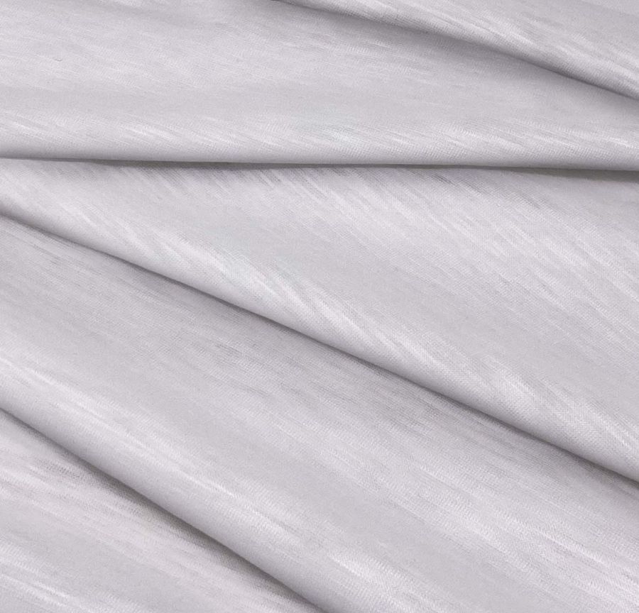 En cuanto a las características generales de la tela base, podemos describir que tiene una textura suave y lisa al tacto, siendo visualmente translúcida y jaspeada, lo que le da un aspecto original y atractivo. Además, es una tela elástica, lo que le proporciona mayor comodidad para utilizarse en prendas de vestir.