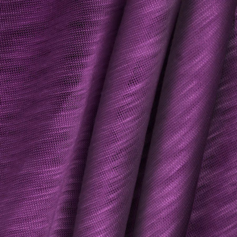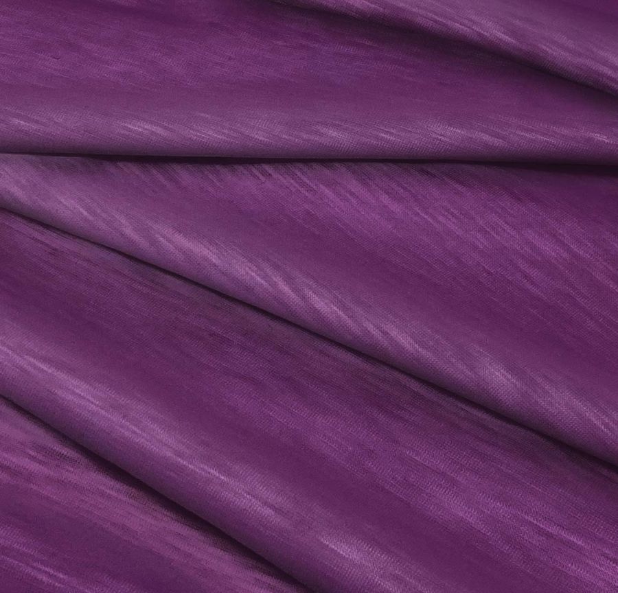 La tela base utilizada en este tejido es el punto camiseta jaspeado Dubái, compuesta por 100% poliéster y con un gramaje de 135 gr/m2. El color liso impreso en esta tela es un morado oscuro con un contenido de CMYK de 67 90 30 23. Este color secundario tiene una connotación de elegancia y sofisticación, y combina perfectamente con otros tonos azules y grises.