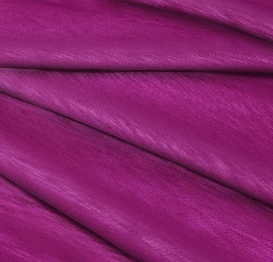 La tela base de esta prenda es el Punto Camiseta Jaspeado - Dubái, compuesta por 100% poliéster y con un gramaje de 135 gr/m2. El color liso impreso es un morado berenjena, cuyo CMYK es 51 100 19 13. El color se asocia con los procesos creativos, la intuición y la introspección, así como con la delicadeza y la sutileza. El morado berenjena combina perfectamente con tonos neutros como el gris y el negro, generando un contraste potente y elegante.