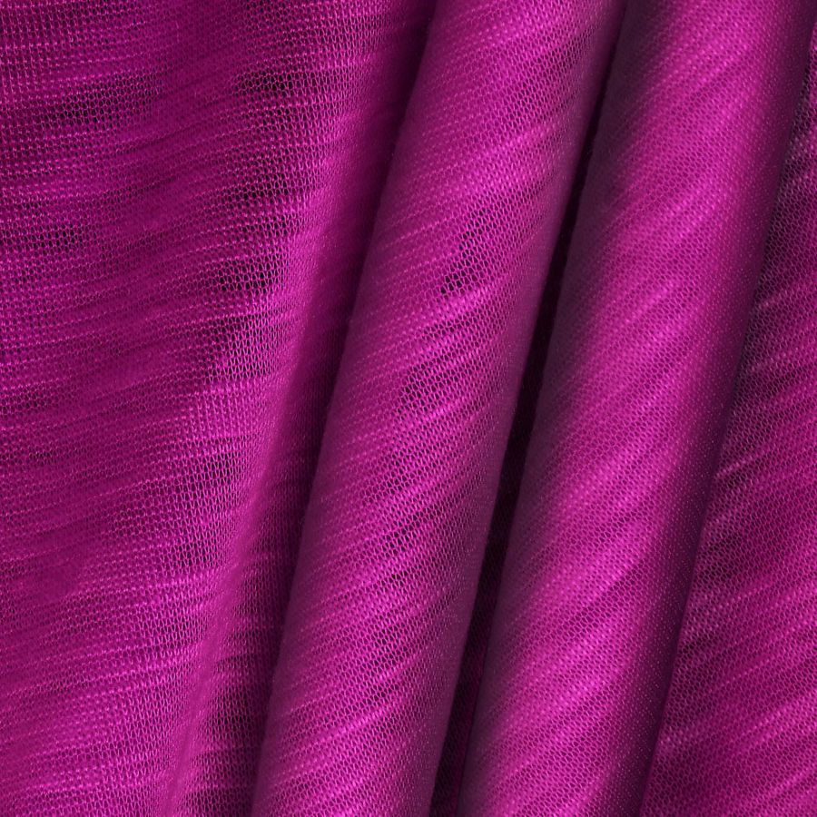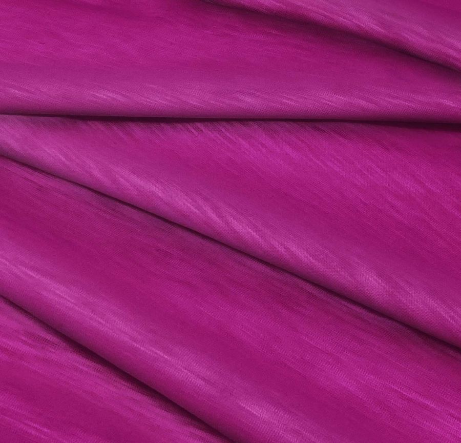 La tela base es Punto Camiseta Jaspeado - Dubái, una tela de punto compuesta por 100% poliéster con un peso de 135 gr/m2 y un ancho de 160 cm. Su color liso es un Morado DarkMagenta con un CMYK de 44, 100, 15, 8. El color secundario es un color intenso pero elegante y sobrio, que combina muy bien con tonos neutros como el gris, negro y blanco, así como con colores complementarios como el verde y el amarillo.