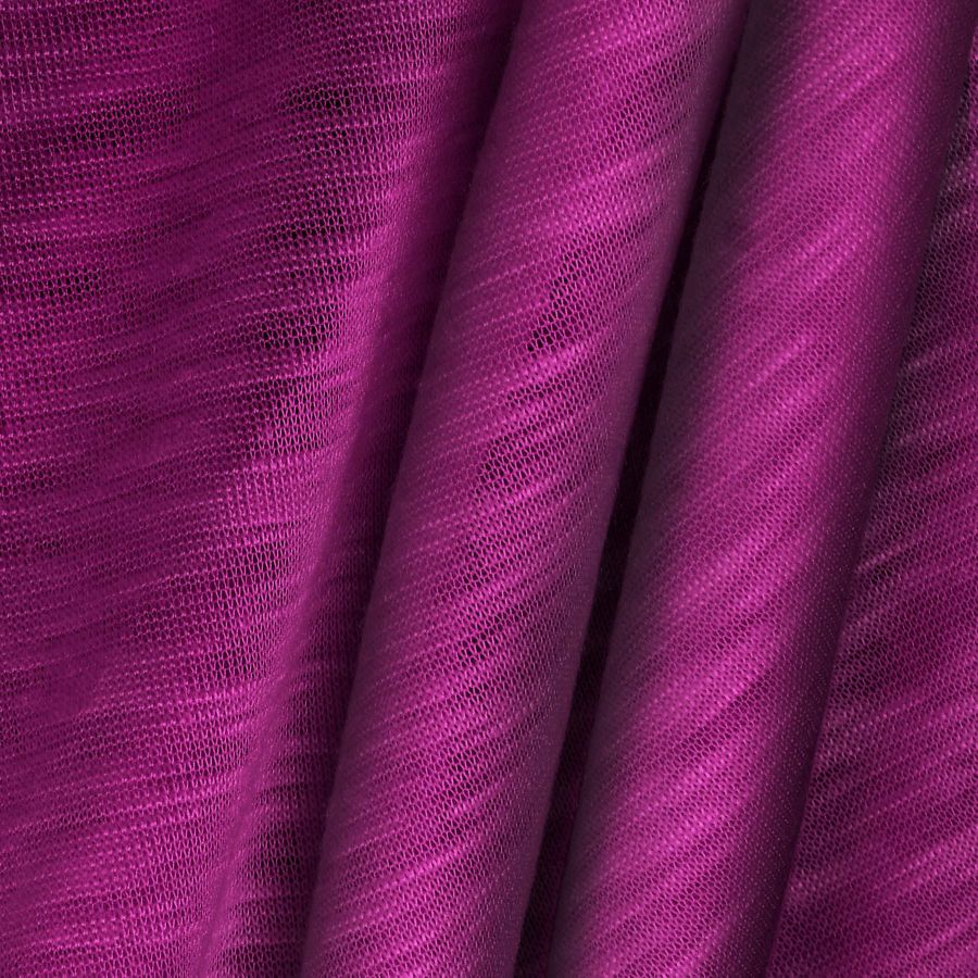 La tela base es el Punto Camiseta Jaspeado - Dubai, compuesta al 100% de poliéster, con un gramaje de 135 gr/m2 y un ancho de 160 cm. El color liso impreso es Morado Berenjena, con un CMYK de 53 99 25 18. Este color es un tono profundo, misterioso y elegante que evoca el poder de lo desconocido. Combina bien con otros tonos oscuros como el negro, gris y azul oscuro. El tejido está impreso con el color liso a una sola cara por impresión digital textil.