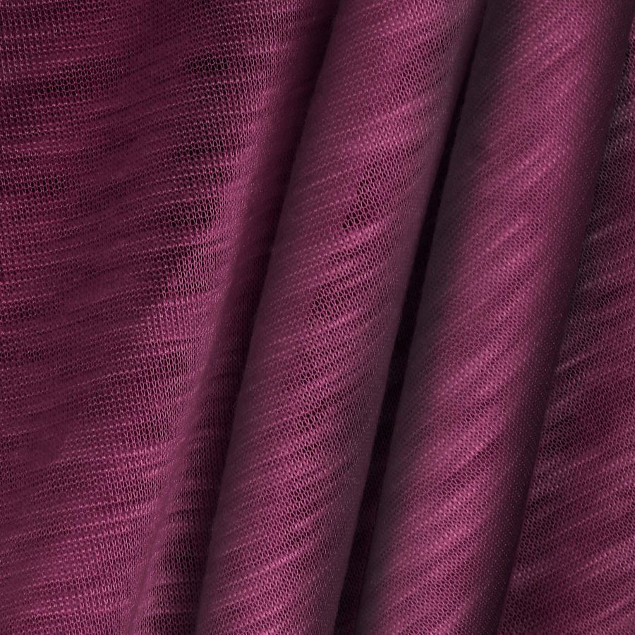La tela base es el Punto Camiseta Jaspeado - Dubái, una tela de punto con composición 100% poliéster, un gramaje de 135 gr/m2, ancho de 160 cm y cuidados específicos. El color liso impreso es de un tono morado-berenjena, con un CMYK de 50 87 39 47. Este color combina especialmente bien con colores tierra y grises.