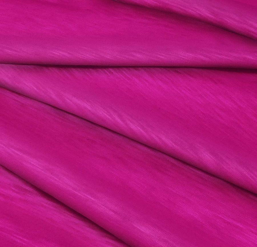 La tela base es el Punto Camiseta Jaspeado - Dubái, una tela de punto con una composición de 100% poliéster, un gramaje de 135 gr/m2, un ancho de 160 cm y una anchura de calada mediana. El color liso impreso es Rosa Clavel Oscuro, en el que se han utilizado las tintas cian, magenta, amarillo y negro en una proporción de 26, 100, 13 y 3 respectivamente, lo que da como resultado un CMYK de 26 100 13 3.