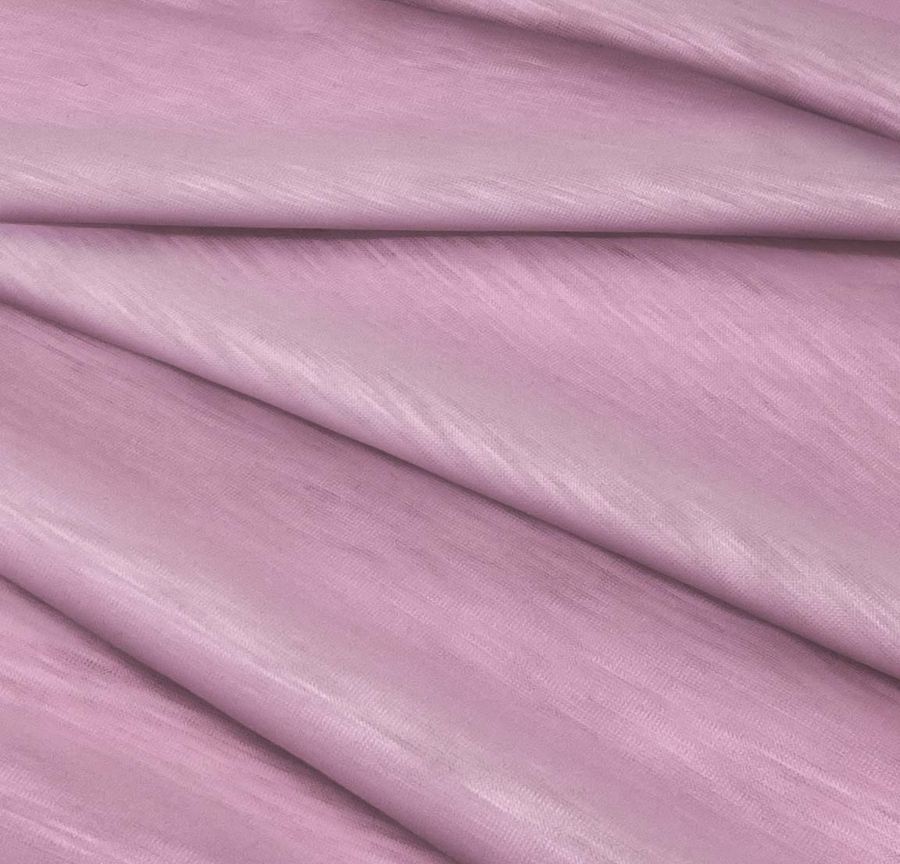 La tela base Punto Camiseta Jaspeado - Dubái, compuesta por 100% poliéster y con un gramaje de 135 gr/m2, es de textura y tacto elástico y presenta un ancho de 160 cm. Su color liso impreso es Rosa Cadillac, cuyo CMYK es de 15 50 9 0, lo que le proporciona un tono rosa claro y vibrante. Este color es complementado por un sutil efecto jaspeado en la tela base, que le brinda profundidad y matices visuales. Combina especialmente bien con blanco, negro y tonos grises.