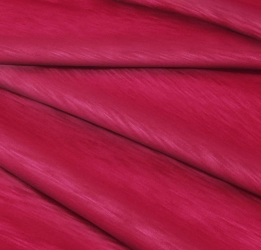 La tela base es Punto Camiseta Jaspeado - Dubái, un tejido de punto compuesto de 100% poliéster, con un gramaje de 135 gr/m2 y un ancho de 160 cm. Este tejido tiene una textura visual y táctil lisa, translúcida y jaspeada. Está impreso con un color liso rojo granate brillante, con un CMYK de 23 100 58 18. Este color es intenso y vibrante, evocando la pasión y el dinamismo. El color secundario, granate brillante, es un color cálido y sofisticado que combina bien con tonos grises, negros, azules oscuros y verdes oscuros.