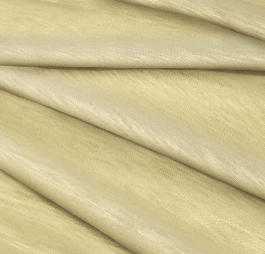 La tela base es el Punto Camiseta Jaspeado - Dubái, de composición 100% poliéster y un gramaje de 135 gr/m2. Su ancho alcanza los 160 cm y se caracteriza por ser una tela de punto con las siguientes atributos: textura lisa y elástica, visual translúcida y jaspeada, y tacto suave y agradable. El color liso impreso es un amarillo sol, que viene representado por medio del CMYK 6 15 50 0. Este tono se asocia con la efervescencia y la energía del sol, y puede combinarse con otros colores como el marrón, negro, blanco, gris y verde. Cabe destacar que la tela está impresa a una sola cara por impresión digital textil, no tratándose de un tejido tintado, sino impreso.