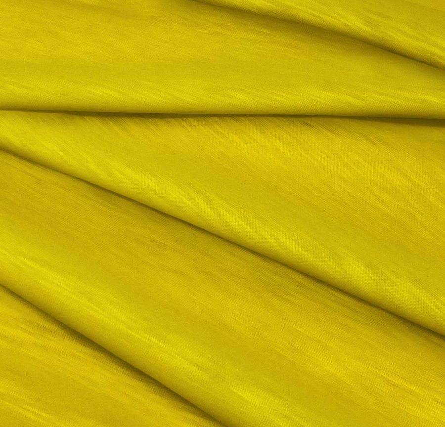 La tela base es el Punto Camiseta Jaspeado - Dubái, un tipo de tela de punto compuesta por 100% poliéster y un gramaje de 135 gr/m2. Su ancho de tela es de 160 cm y tiene una temporada atemporal. El color liso impreso es Amarillo profundo, cuyo CMYK es 13 25 96 2 y está impreso a una sola cara por impresión digital textil. Este color secundario presenta una profundidad intensa y cálida, que combina perfectamente con otros colores análogos como el naranja y el rojo, y con su complemante, el azul verdoso.