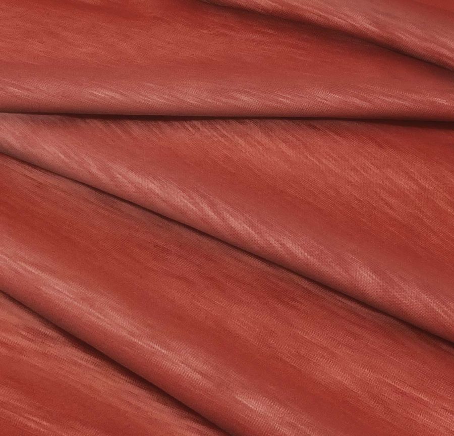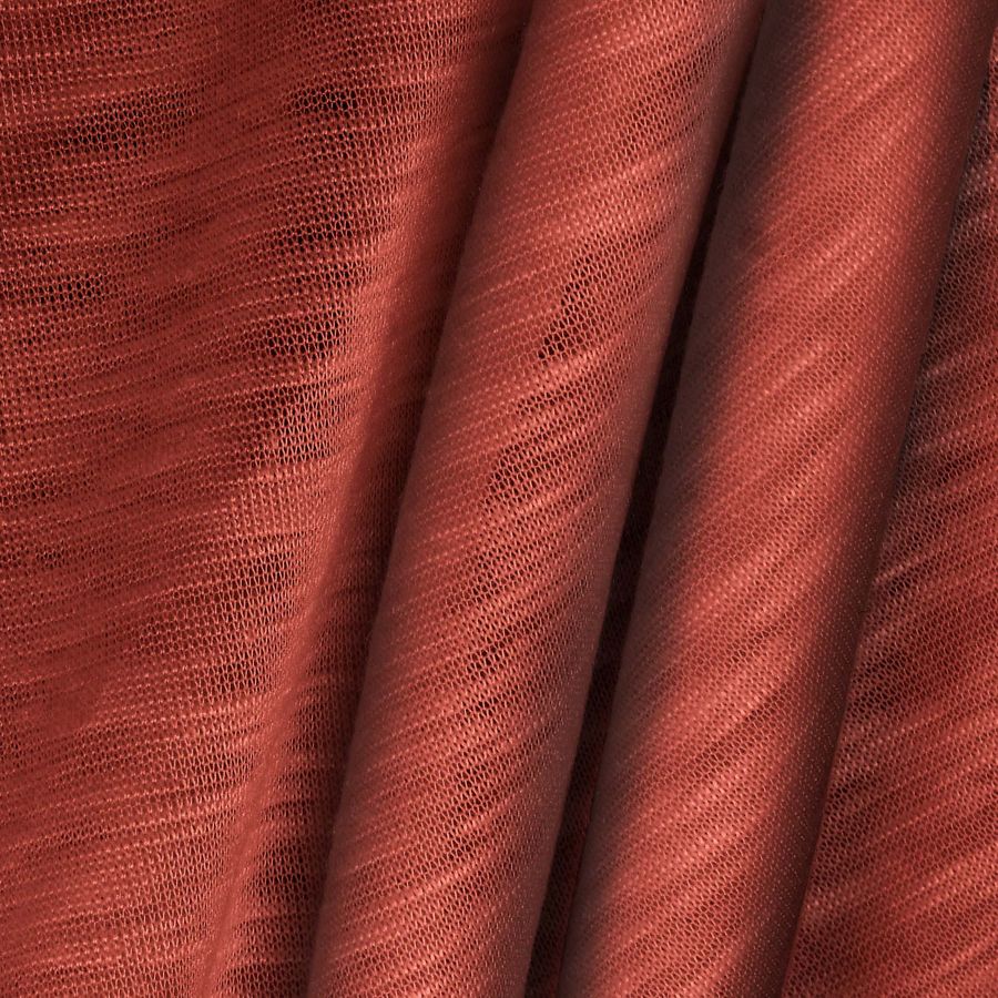 Las características de la tela base son diversas, desde su textura y tacto liso y elástico, hasta su visualidad tanto translucida como jaspeada. En cuanto al color liso, se aprecian los tonos rojos y granates, que consiguen un efecto cálido y energético en el tejido.