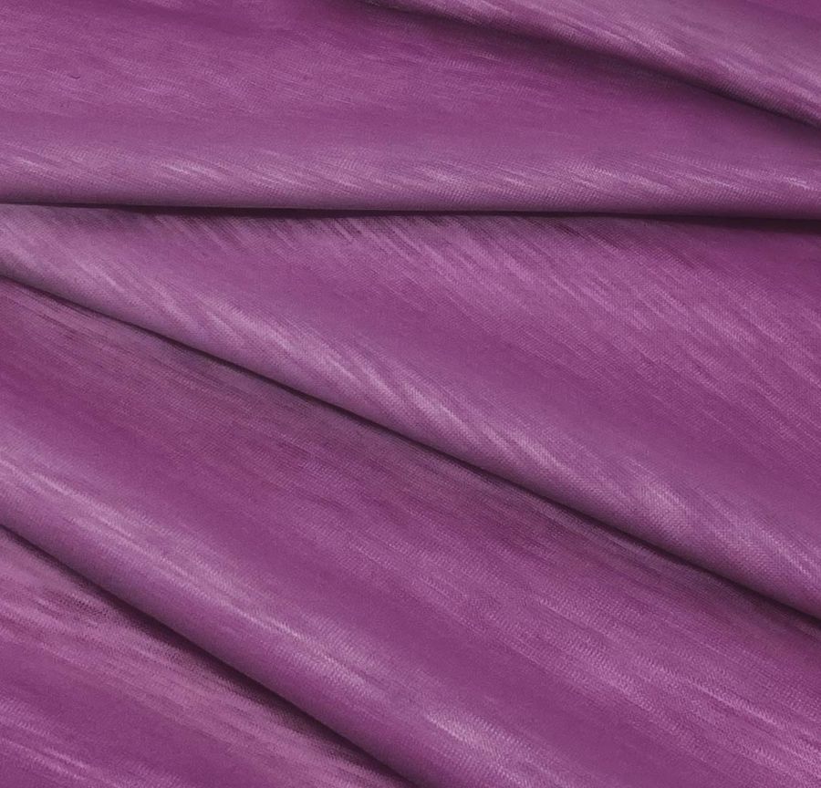 La tela base es el Punto Camiseta Jaspeado - Dubái, una tela de punto compuesta al 100% de poliéster con un gramaje de 135 gr/m2 y un ancho de 160 cm. Su color liso impreso es Viola, con una combinación de tintas CMYK de 54 78 26 11. Este color presenta una tonalidad morada con matices violáceos, que le otorgan un carácter elegante y sofisticado. Se combina bien con colores neutros como blanco, beige y gris, y también con tonos más atrevidos como fucsia o turquesa.