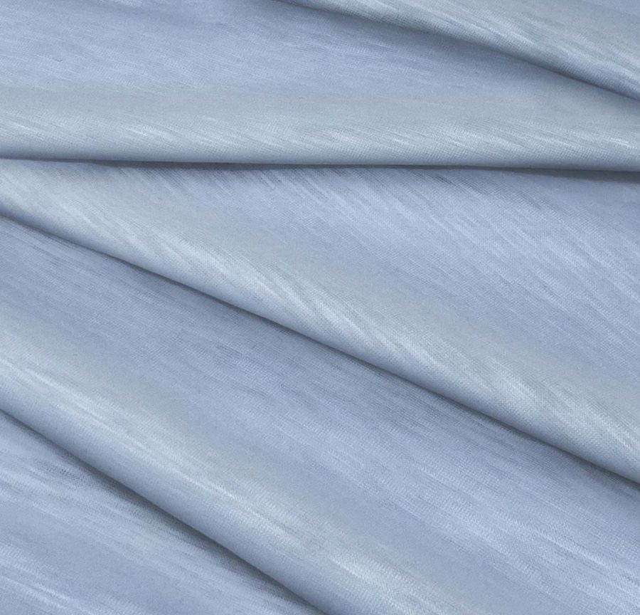 La tela base es el Punto Camiseta Jaspeado - Dubái, una tela de punto compuesta al 100% por poliéster, con un gramaje de 135 gr/m2 y un ancho de 160 cm. Destaca por su textura lisa y jaspeada, así como por su tacto suave y elástico. En cuanto al color, se trata de un azul aciano impreso con tecnología de sublimación, con un CMYK de 42 25 3 0 y un bajo contenido en negro. Este color secundario tiene un tono vibrante, aportando frescura y vitalidad a la prenda. Combina muy bien con tonos blancos, grises y verdosos, por su similitud con el color agua. Es importante destacar que el tejido está impreso con el color liso a una sola cara por impresión digital textil, lo que permite una alta definición y una gran variedad de tonalidades.