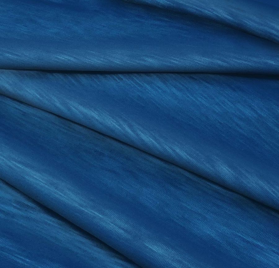 La tela base, Punto Camiseta Jaspeado - Dubái de composición 100% poliéster, cuenta con un gramaje de 135 gr/m2 y un ancho de 160 cm. Su color liso impreso es un vibrante Azul Lapislázuli, conformado por la combinación de tintas CMYK: Cyan 99, Magenta 73, Yellow 30, Black 15. Combinado con tonalidades más claras de azul, blanco y gris, genera un look sofisticado y moderno en cualquier prenda o accesorio.