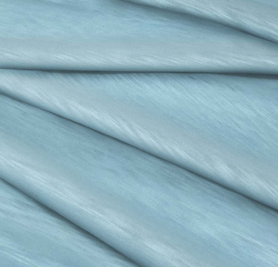 La tela base, Punto Camiseta Jaspeado - Dubái, es una tela de punto de 100% poliéster con un gramaje de 135 gr/m2 y un ancho de 160 cm. Este tejido presenta una textura elástica y translúcida, y su color liso es el Azul Koi. Este tono se compone de 48% tinta Cyan, 13% tinta Magenta, 12% tinta Yellow y 0% tinta Black, lo que lo hace un tono brillante y vivo. El color secundario que se desprende de su tonalidad es un azul verdoso con matices ácidos, que combina perfectamente con tonos neutros como el gris o el blanco.