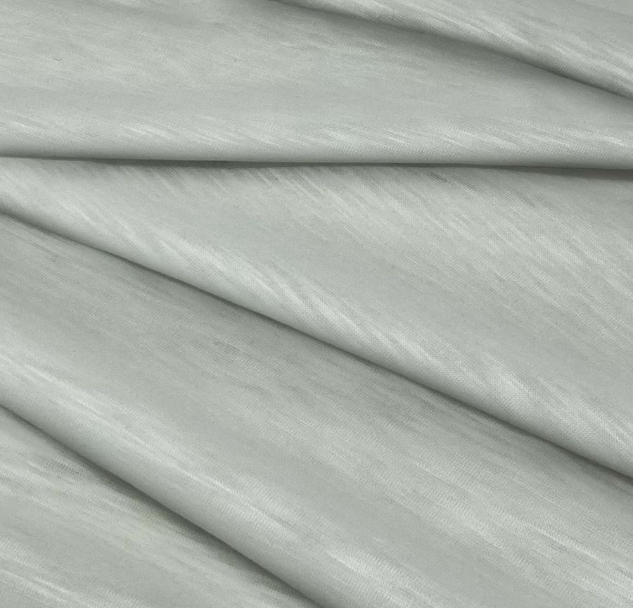 En cuanto a las características generales, la tela base presenta una textura lisa y elastica al tacto, visiblemente translúcida y jaspeada. Estas cualidades la hacen perfecta para la elaboración de prendas de moda para mujeres y hombres, especialmente camisetas de punto. Además, la tela es atemporal, lo que significa que se puede usar en cualquier época del año.