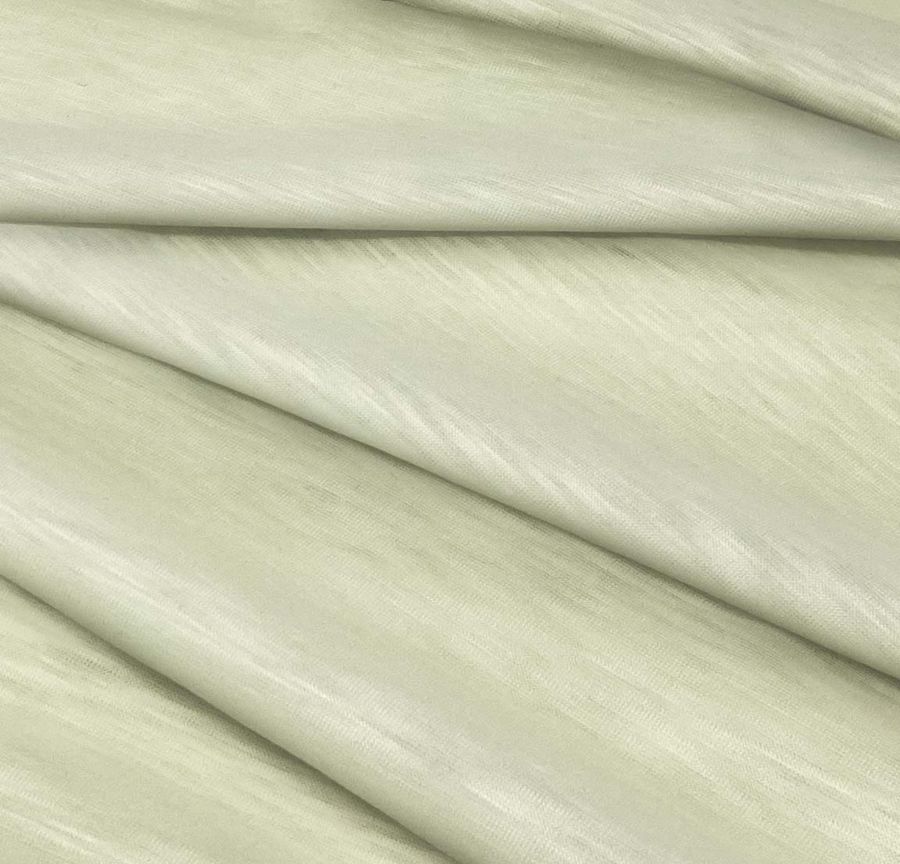 La tela base, Punto Camiseta Jaspeado - Dubái, es de tipo punto y está compuesta 100% de poliéster, con un gramaje de 135 gr/m2 y un ancho de 160 cm. El color liso impreso es una combinación de verde y crema, con un CMYK de 9 1 33 0. Esta combinación refleja una sensación natural y armoniosa, que transmite tranquilidad y frescura. El verde representa la naturaleza y el crema la calidez, lo que combinado con el jaspeado de la tela, crea una textura visual translucida, suave al tacto y con una elásticidad que la hace cómoda al utilizar.