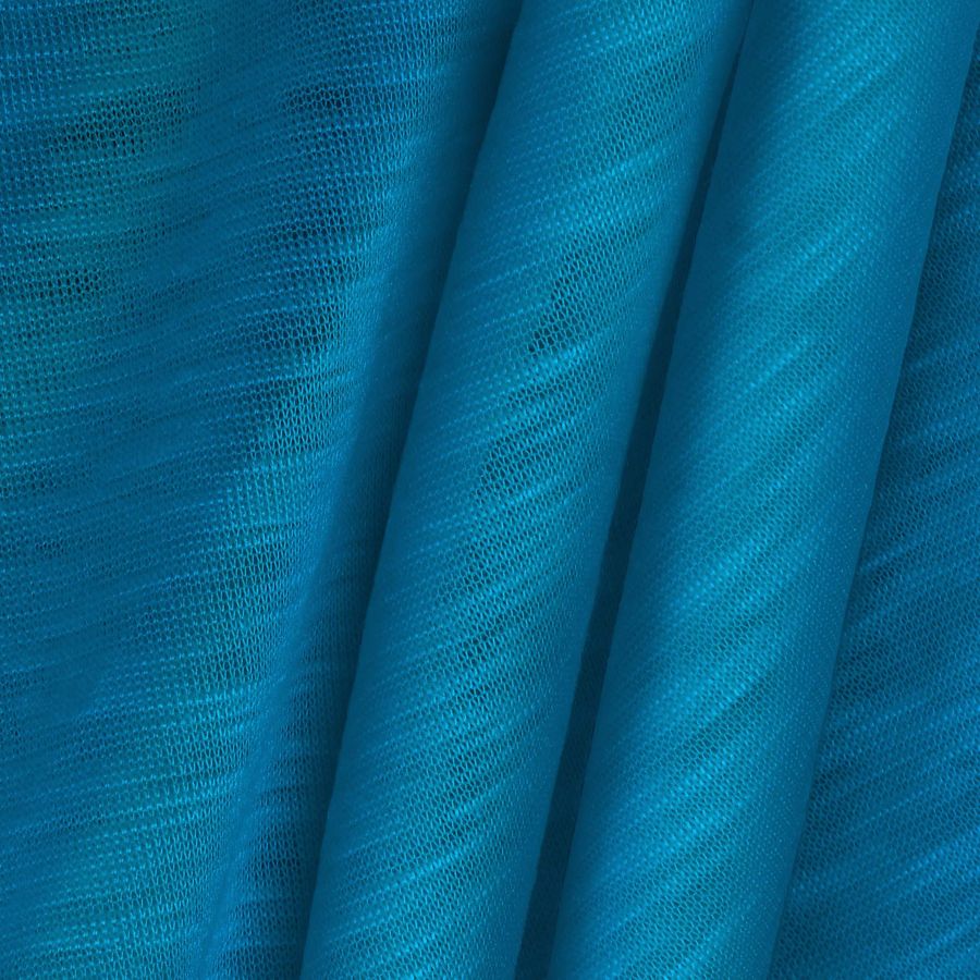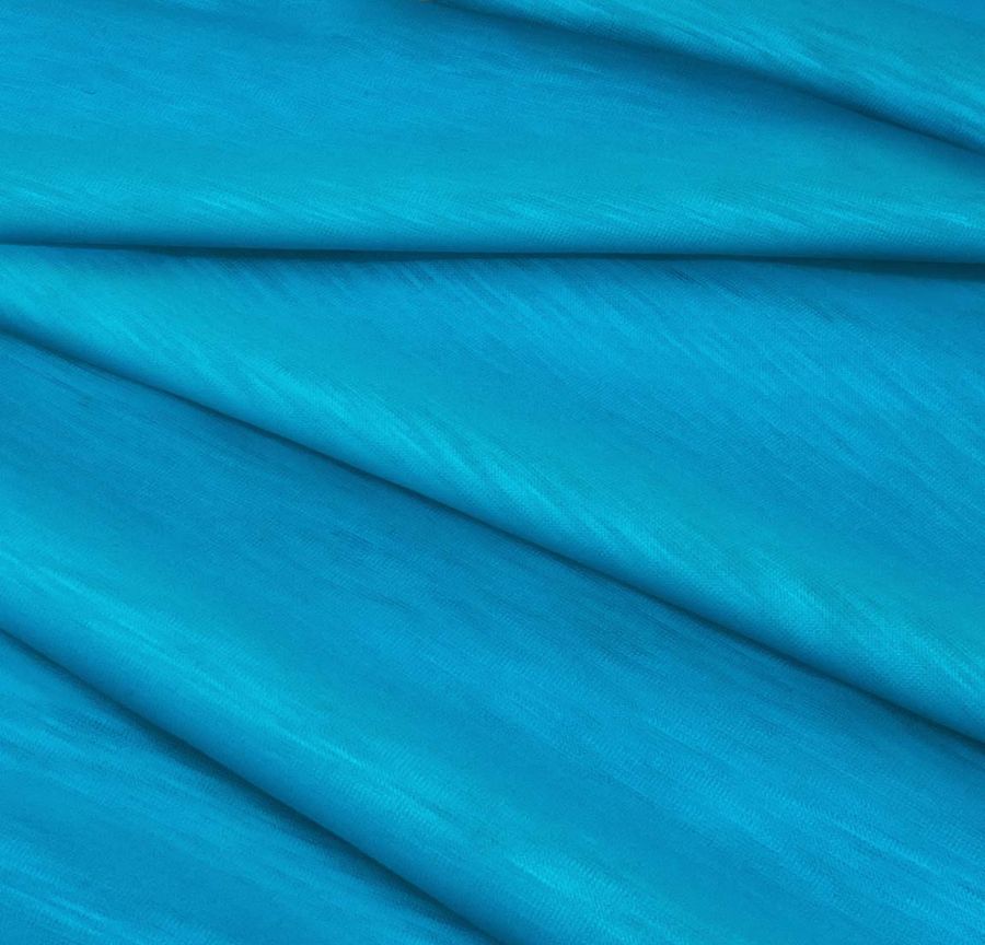 La tela base es la Punto Camiseta Jaspeado - Dubái, una tela de punto compuesta por 100% poliéster, con un gramaje de 135 gr/m2 y un ancho de 160 cm. El color liso impreso es Azul Mariposa, que se produce mediante la impresión digital textil con una combinación de tintas CMYK, presentando una alta concentración de Cyan y una baja concentración de Magenta. Este color refleja un aspecto cálido y suave, evocando la tranquilidad y la relajación propias de la naturaleza. Su combinación con otros colores se hace especialmente con tonos neutros como grises y blancos, aportando una sensación de serenidad y armonía.