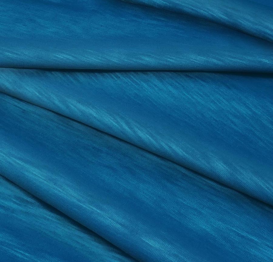 La tela base de esta descripción es el Punto Camiseta Jaspeado - Dubái, una tela de punto hecha de 100% poliéster con un gramaje de 135 gr/m2 y un ancho de 160 cm. En cuanto al color del tejido, se trata de un tono Azul Arrendajo, con un CMYK de 95 60 28 13. Este color presenta una combinación de tonalidades azules y verdes, evocando la naturaleza. Se puede combinar con otros colores como el blanco, negro, gris y verde oliva, entre otros.