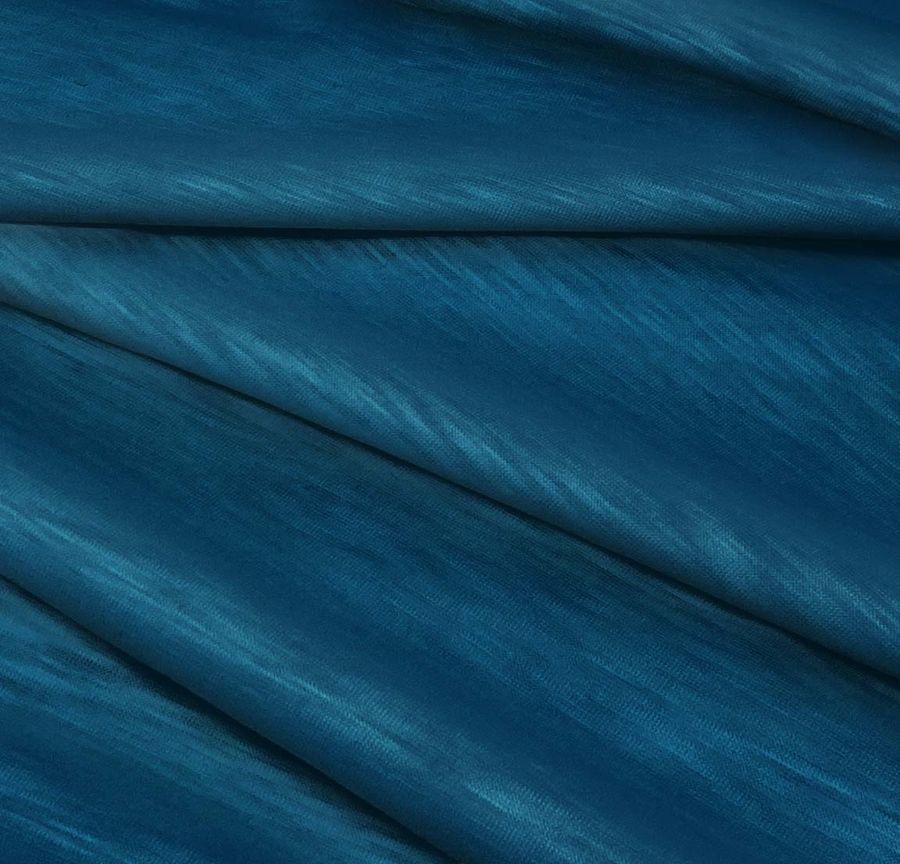 La tela base de esta prenda es Punto Camiseta Jaspeado - Dubái, con una composición de 100% poliéster y un gramaje de 135 gr/m2. El tejido tiene un ancho de 160 cm y está disponible en un color azul marino profundo que se consigue mediante la técnica de sublimación, con las tintas CMYK en una proporción de 98 de cian, 66 de magenta, 40 de amarillo y 32 de negro.