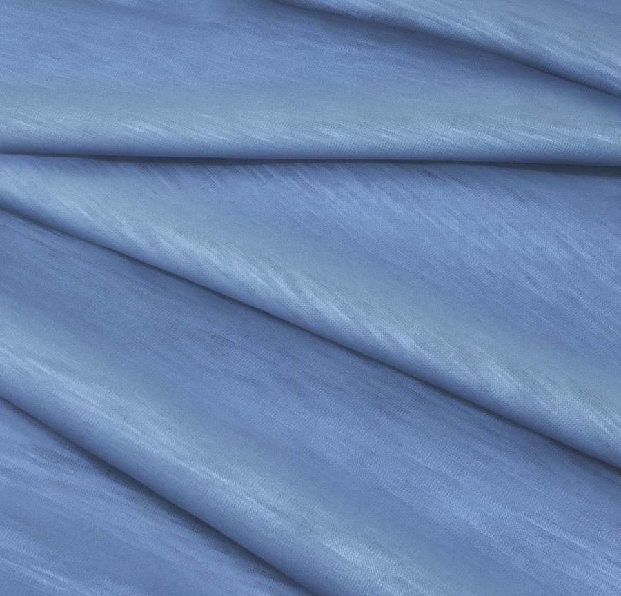 La tela base es la Punto Camiseta Jaspeado - Dubái, una tela de punto con composición 100% POLIÉSTER, un gramaje de 135 gr/m2 y un ancho de 160 cm. El color liso impreso es de tonalidades Azul y Azul celeste, con una mezcla de tinta Cyan: 65, Magenta: 45, Yellow: 5 y sin presencia de tinta negra (CMYK: 65 45 5 0). Se trata de un color fresco, que transmite tranquilidad y suavidad. Dental con el color secundario, podemos encontrar en el mercado piezas en tonos grises como un perfecto acompañante, así como tonos cálidos beige o arena para crear un contraste elegante y veraniego. Cabe destacar que la tela está impresa con el color liso a una sola cara por impresión digital textil, es decir, no se trata de un tejido tintado.