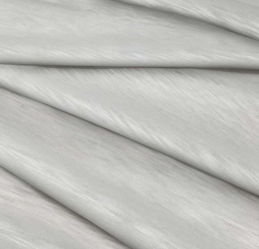 La tela base Punto Camiseta Jaspeado - Dubái, compuesta por 100% poliéster y con un gramaje de 135 gr/m2, presenta un ancho de tela de 160 cm. Su color liso impreso, conocido como Gris Ganso, es una mezcla cromática que utiliza las tintas Cyan, Magenta y Yellow en una proporción de 18:15:16 respectivamente, mientras que no utiliza tinta negra en su creación. Esta mezcla produce una tonalidad grisácea, con un matiz verdoso y cierto brillo satinado. Su combinación con otros colores se enriquece con tonos oscuros de azul y verde, así como con el rojo burdeos.