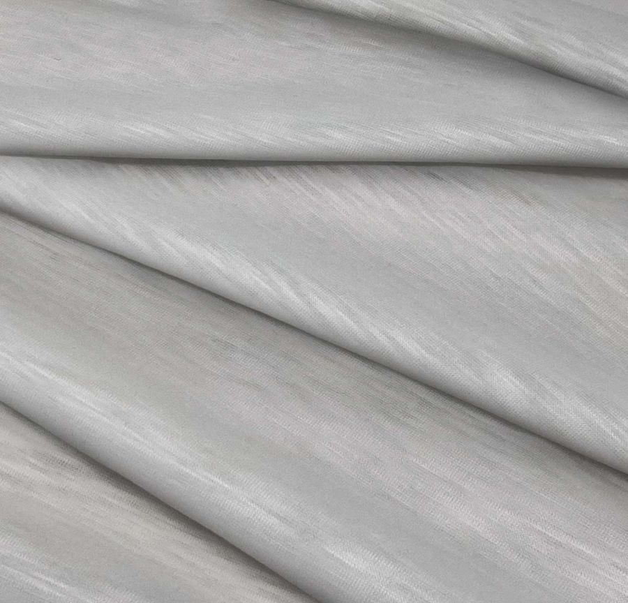 El color secundario de este tejido tiene tonalidades grises y se destaca por su apariencia jaspeada, lo que le da un efecto visual diferente. El color combina bien con colores blanco, negro y tonos anaranjados. En cuanto a las características generales del tejido, la textura y el tacto son lisos, mientras que la textura visual es translúcida y jaspeada. La tela base es elástica, lo que proporciona una mayor comodidad y ajuste al cuerpo.