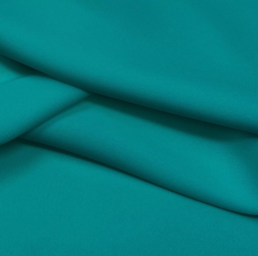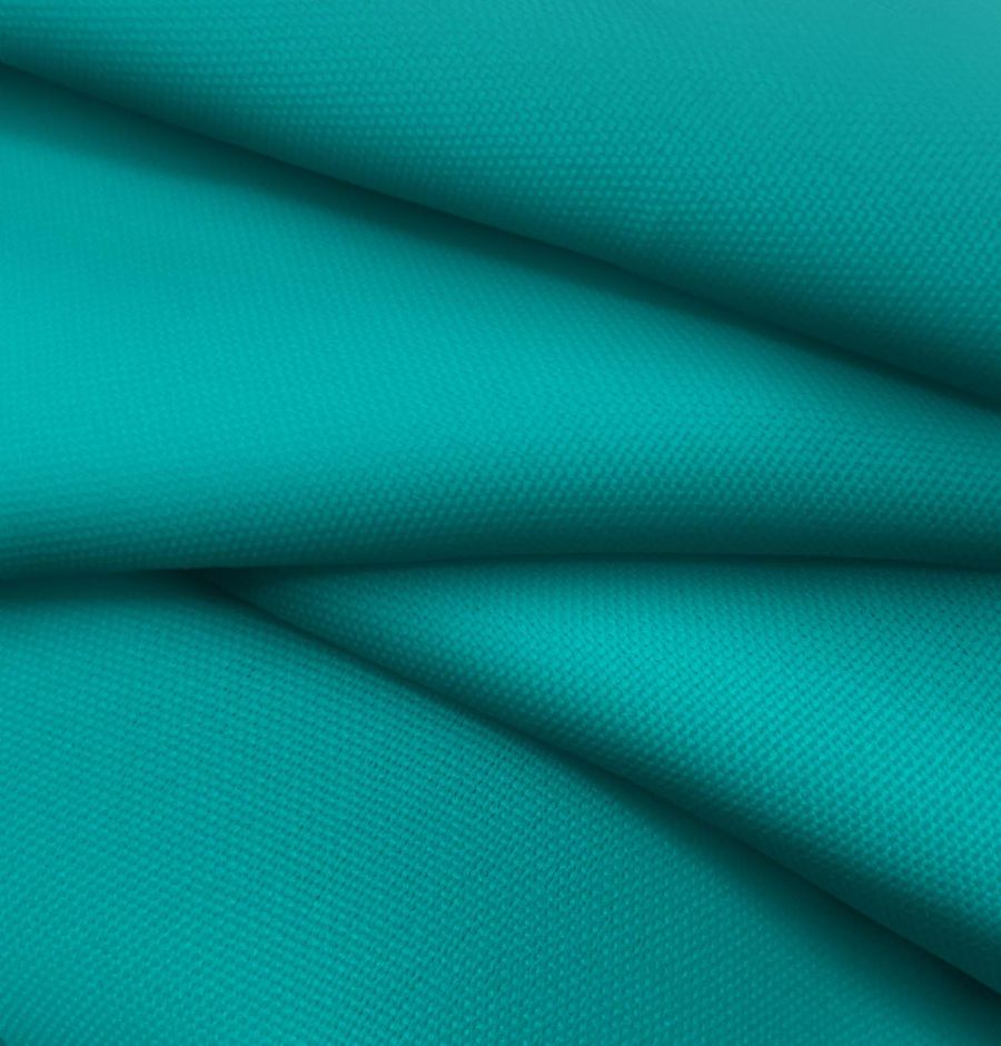 La tela base es el Tejido Hidrófugo Antibacteriano - Tromso, compuesta por poliéster y con un gramaje de 160 gr/m2. El color liso impreso es un tono de verde azulado expresado en CMYK 82 25 45 8. Simbólicamente, este color representa el equilibrio entre la calma del azul y la energía del verde. Técnicamente, esta tonalidad se imprime a una sola cara por impresión digital textil. Además, esta tela tiene propiedades hidrófugas e antibacterianas, y su textura es rugosa al tacto.