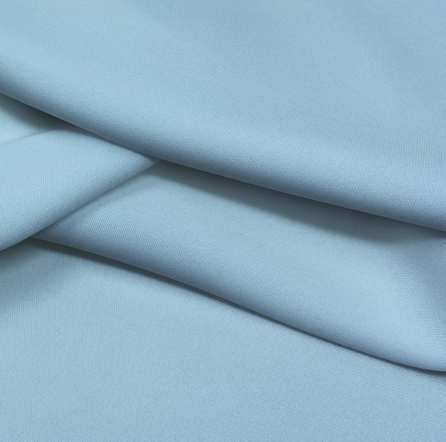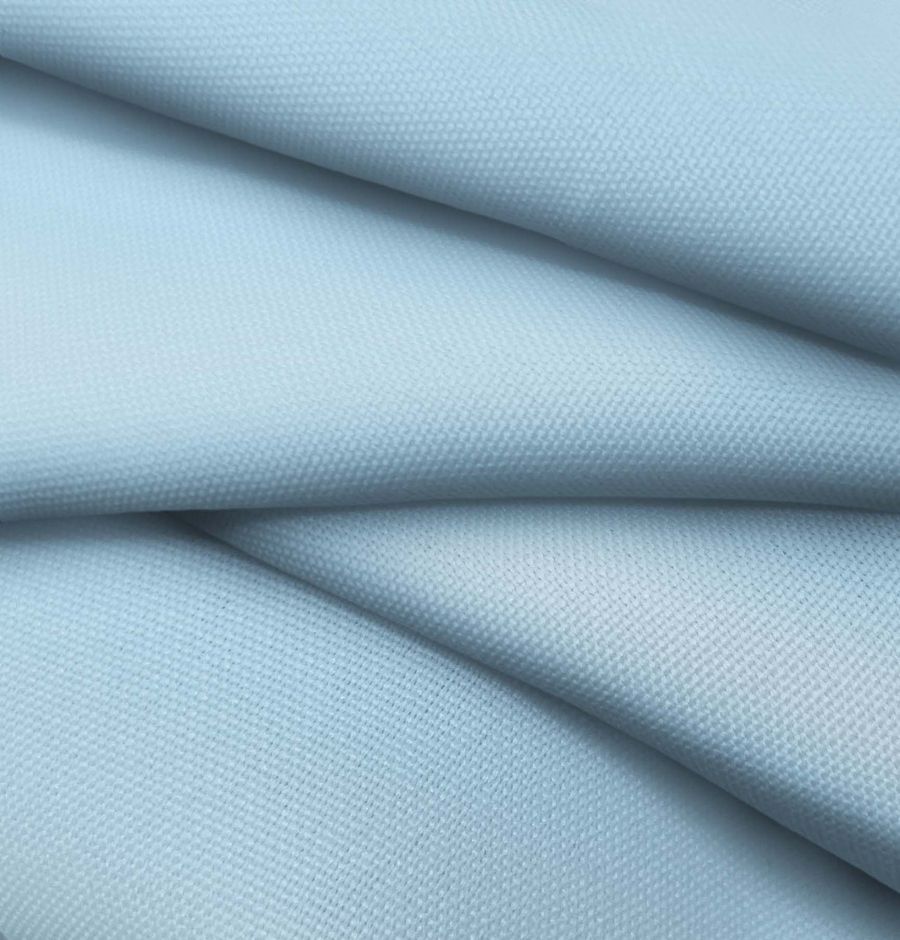 La tela base es el Tejido Hidrófugo Antibacteriano - Tromso, un tejido técnico de 100% POLIÉSTER con un gramaje de 160 gr/m2 y un ancho de 150 cm. El color liso impreso es un Azul claro del día, con un CMYK de 41 8 2 0. Este color evoca sensaciones de tranquilidad, serenidad y frescura. Combinado con tonos blancos, cremas y beiges, es capaz de generar una atmósfera relajante y agradable.