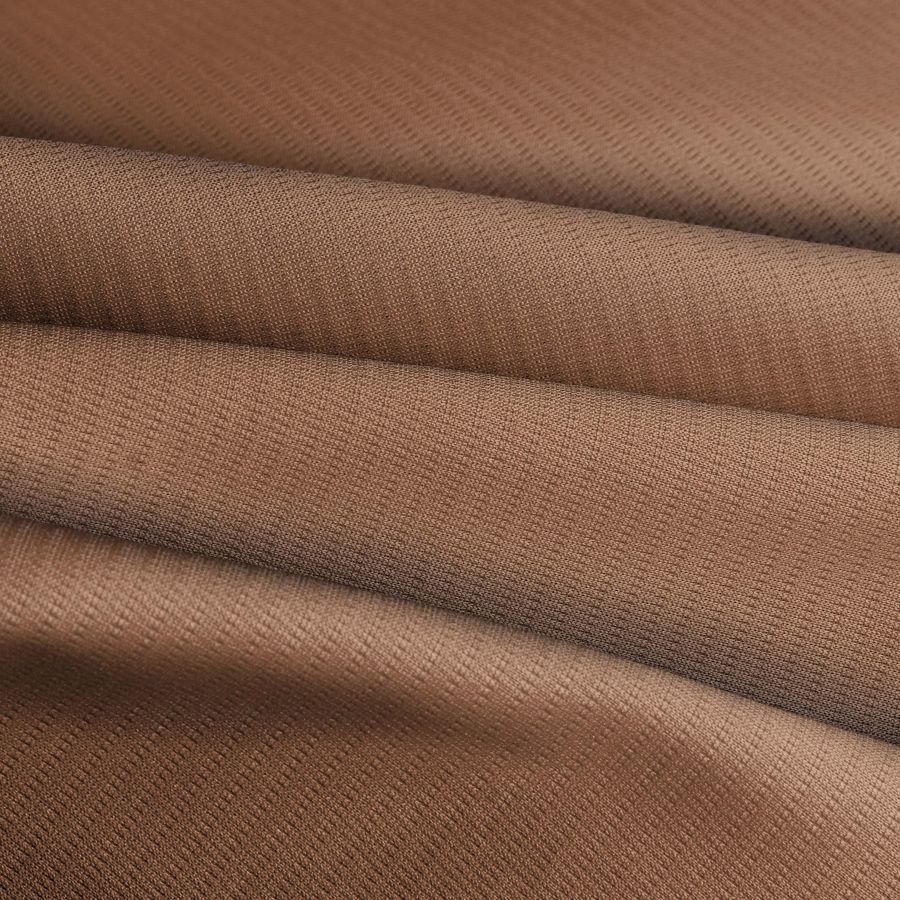 La tela base es un Tejido Técnico Transpirable - Fresh de 100% Poliéster, con un gramaje de 135 gr/m2 y un ancho de 150 cm. El color liso impreso es un tono Marrón Oso Café creado a partir de una combinación CMYK de 33 58 68 35. La textura es suave al tacto y el tejido es elástico y transpirable, lo que lo hace ideal para la confección de prendas deportivas como camisetas, coleteros y scrunchies para mujeres, hombres y niños durante cualquier época del año.